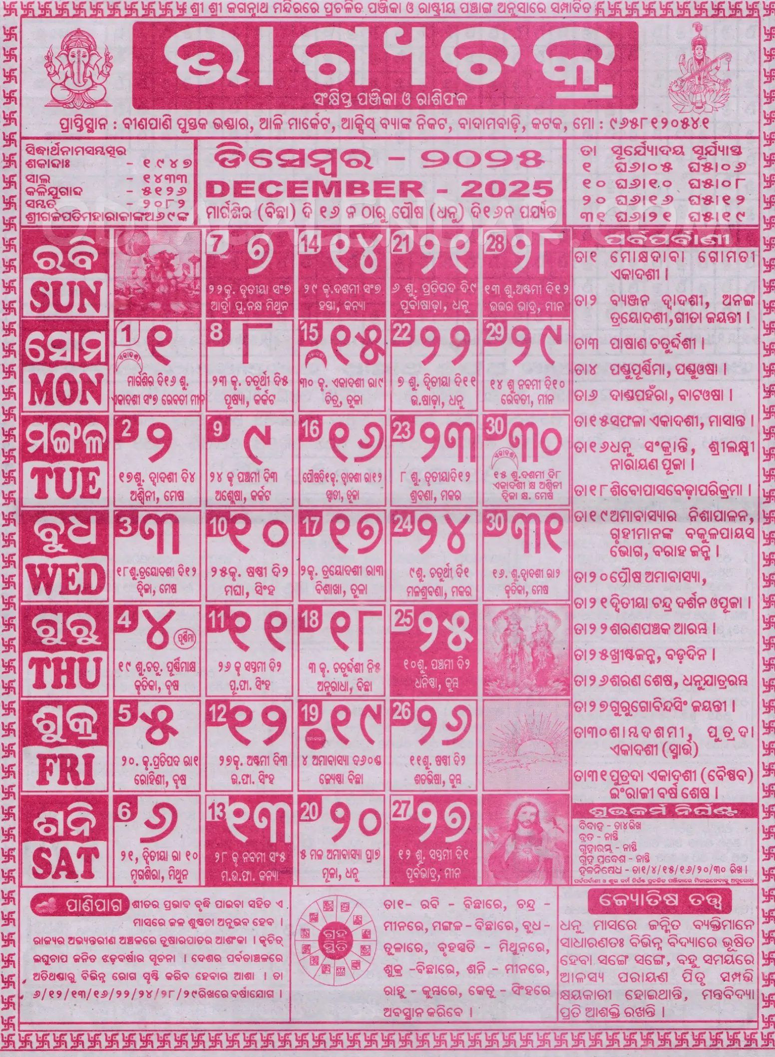 Bhagyachakra Calendar is one of the Odia Calendar, which is very popular in most part of the Odisha. You can view and download this Bhagyachakra Odia Calendar 2025 as PDF and HD quality image format. This bhagyachakra calendar and panjika is created and counted by Pandit Sri Binapani Acharya. To prepare this calendar data has been taken from bhagyachakra panjika. This Odia Calendar and Panjika is voted No. 6 Odia Calendar by viewers of the odiacalendar.com
