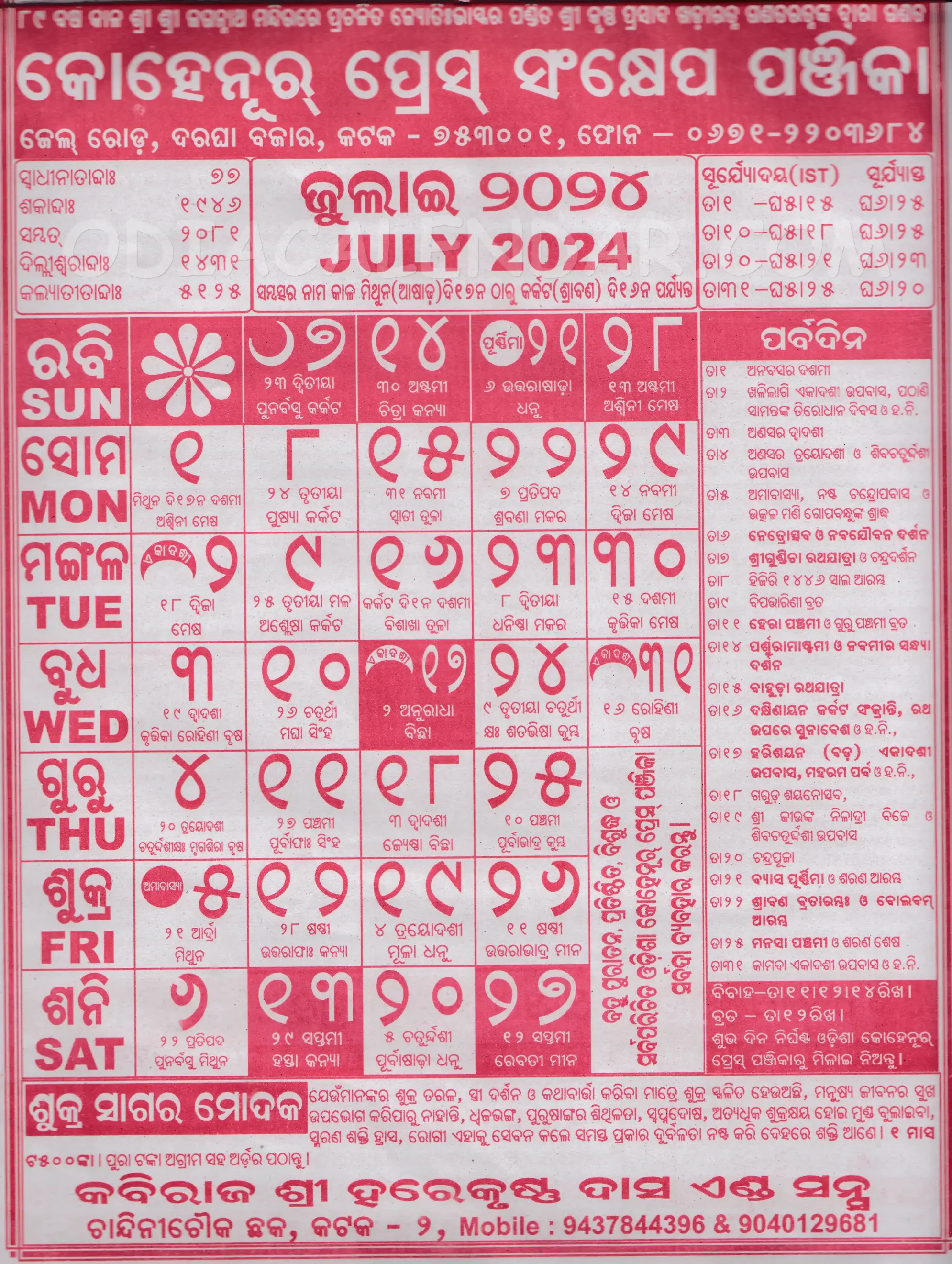Kohinoor Calendar is one of the Odia Calendar, which is very popular in most part of the Odisha. You can view and download this Kohinoor Odia Calendar 2024 as PDF and HD quality image format. The Kohinoor press Calendar and Panjika is created and counted by Pandit Sri Krushna Prasad Khadiratna. This Odia Calendar has been used in Sri Sri Jagannath temple since past 89 years. To prepare this Odia Kohinoor Calendar 2024 data has been taken from Kohinoor press Panjika. This Odia Calendar and Panjika is voted No. 1 Odia Calendar by viewers of the odiacalendar.com